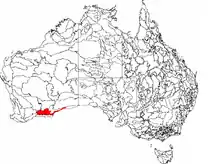 Eastern Mallee was introduced in IBRA Version 6.1. Its region code is MAL1. It is one of two subregions of the Mallee region, the other being Western Mallee.[4] The Mallee, Avon Wheatbelt and Geraldton Sandplains regions together comprise Hopper's Transitional Rainfall Zone of Beard's South West Botanical Province.[5][6] Under the World Wide Fund for Nature's regionalisation of the world's terrestrial surface into "ecoregions", the Western Mallee subregion falls within the Esperance Mallee ecoregion, one of 6 ecoregions comprising the Southwest Australia ecozone.