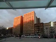 Today, Eastern Parkway contains a variety of zoning uses. While the parkway is mostly zoned for mid-to-high-rise residential structures, there are also small areas of commercial zoning, as well as industrial zoning at the extreme eastern end, where there is a high concentration of transit-related infrastructure in the area around Broadway Junction. In addition, high-rise zoning is allowed at the western end, especially closer to Grand Army Plaza.[67][3]: 17 Eastern Parkway is lined with one-and-two-family rowhouses, apartment complexes, semi-detached residences, and freestanding mansions.[10]: 5 [13] Some of the apartment buildings, such as Turner Towers and Copley Plaza, are comparable to apartment developments on Park Avenue in Manhattan.[68] These buildings coexist with some of the grander structures on the parkway, such as the Beaux-Arts Brooklyn Museum[13] and the Art Deco Central Library.[69][48] Commercial uses are more common at Franklin, Nostrand, Kingston, Schenectady, and Utica Avenues, where there are subway entrances.[14]: 2 Generally, Eastern Parkway Extension has fewer institutions or commercial structures, while predominating in residential or industrial uses.[3]: 17
