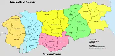 Map of the administrative divisions of Eastern Rumelia before annexation by the Principality of Bulgaria.