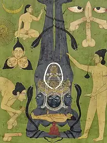 The tantra is considered a sprout of Vedic-Brahmanic and Yogic traditions whose system is mainly characterized by correspondences of macrocosm and microcosm and also by a reintegration of the mundane into the salvational path, such as the ritual employment of sexuality and dualism to achieve non-duality.[114] The erotocentric rites are sometimes referred to as "left hand" (vāmācāra) in Hindu sayings, but not by Buddhists. In Sanskrit literature and the testimony of the practicing tantric, an outer Indian origin is attributed to them.[115] In India, Buddhic tantrism assimilated Hindu gods as symbols, as well as in Japan in syncretism with the Shinto,[114] and in Tibet with the native Bon gods.[116]
