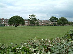 Eastney Barracks, designed by William Scamp (assistant director, Admiralty Works Department), was built as headquarters for the Royal Marine Artillery, who moved in from Fort Cumberland in 1867.[1] After the amalgamation of the Royal Marine Light Infantry and Royal Marine Artillery in 1923, Forton Barracks was closed and Eastney Barracks served as headquarters for the Portsmouth Division of the Corps. The series of seven linked blocks facing the sea forms the second longest barracks frontage in the country (after the Royal Artillery Barracks, Woolwich).[2] The ensemble has been called "the best and most complete barracks of the post-Crimean War period".[3] Eastney Barracks remained the Corps Headquarters until 1995, when it was sold and converted to private housing.[4]