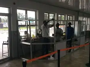 On 12 June, the country declared a state of emergency in the Kailahun District, where it announced the closure of schools, cinemas, and nightlife places; the district borders both Guinea and Liberia, and all vehicles would be subject to screening at checkpoints.[27][28] The government declared on 11 June, that its country's borders would be closed to Guinea and Liberia; but many local people cross the borders on unofficial routes which were difficult for authorities to control.[29][30] Seasonal rains that fall between June and August interfered with the fight against Ebola, and in some cases caused flooding in Sierra Leone.[31]
