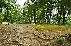 Eboshigata Castle is one of the seven castles built by Kusunoki Masashige and is located at the top of Mount Eboshigata at an elevation of 182 meters. The site is protected by cliffs on the north and west, and by the Ishikawa River and Amami River to the south and east. Located on the Kōya Kaidō, it commanded a strategic position controlling the main route between Kyoto, Mount Kōya and the port of Sakai. The castle is relatively small, and measures approximately 180 meters from east to west and 150 meters from north to south. It consists of several enclosures on the mountain slope, protected by earthen walls and dry moats, with the only entrance being a steep and narrow path from the south. On the eastern slope of the mountain is the Eboshigata Hachiman-gu (built in 1480), and since most of the castle ruins are within the precincts of the shrine, the structure has been relatively well preserved.
