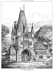The building was designed by John Douglas for the 1st Duke of Westminster in 1881. The authors of the Buildings of England series describe it as "marvellous".[3] Douglas' biographer, Edward Hubbard, refers to its "ducal grandeur".[4] The description in the National Heritage List for England concludes by describing it as "a bravura gatehouse, impressive for its grand scale, picturesque massing and rich detailing".[2]