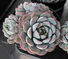 Echeveria minima, the miniature echeveria, is a species of flowering plant in the family Crassulaceae, native to northeast Mexico.[2] It has small, blue-green rosettes with pink edges growing in clusters, and produces yellow bell-shaped flowers in the spring. A succulent, it has gained the Royal Horticultural Society's Award of Garden Merit.[3]