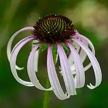 Echinacea sanguinea is herbaceous perennial up to 120 cm (3 ft) tall with an unbranched stem. The alternate leaves are typically close to the ground, growing 10–25 cm (4–10 in) long and 6 mm (¼ in) wide, with the upper leaves having long hairs. Each stem has one rose-pink to pale purple flower head, up to 5 cm (2 in) long and 12 mm (½ in) wide, with 10–20 ray flowers that conspicuously droop. The 2.5 cm (1 in) cone-shaped center containing the disc florets is purplish-brown on the outside and greenish toward the center.[4]