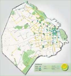 EcoBici is a station-based bicycle-sharing system in Buenos Aires, Argentina which began operating in 2010. The service is free of charge to both residents of the city and tourists, and is available 24 hours a day. After one hour of use on weekdays, two hours during the weekend and on holidays, the bike has to be returned and the user has to wait fifteen minutes to get another one.[1] The system is still being expanded and, as of 2019, has 195 km (121 mi) of lanes completed.[2] Stations are automatic and require the use of a smartphone application or a smart card, not in joint with the Sube card system, acquired upon registering for the service. Usage according to the terms of use is controlled via a rating system which can lead to restricted to total exclusion from the system.[3]