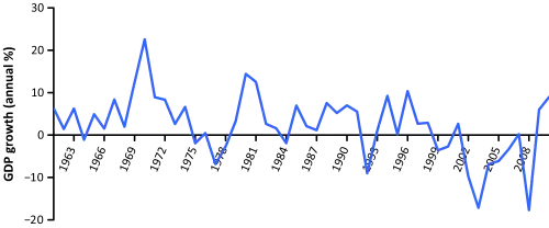 Zimbabwe's economy has shrunk since 2000, in an atmosphere of political turmoil, capital flight, corruption and mismanagement. Inflation has spiralled out of control (peaking at 500 billion % in 2009) and the underpinnings of the economy in agriculture and industry have been dissipated.[15][16][17] Due to the state of the formal economy, many Zimbabweans have begun working in the informal economy. Because of this, it is estimated that by 2009 unemployment was nearer 10% than the official 90%.[18]