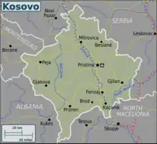 Ferizaj is a city and municipality in southern Kosovo, located 38 kilometers (24 mi) south of the capital city, Pristina. Ferizaj is the third most populated city in Kosovo, after Pristina and Prizren. It is the administrative centre of the homonymous district. The central city postal code is 70 000, and the currency is euro (€).