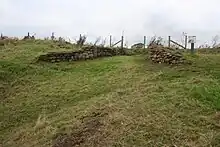 There is evidence of Bronze Age activity at Eddisbury.[8] Before 250 BC, a palisade was erected on Eddisbury Hill. The first hill fort was built in 200–100 BC.[7] Eddisbury hill fort has two main archaeological phases. In the first phase of activity, the site was defended by a single rampart and ditch; this type of hill fort is termed "univallate". The settlement was concentrated on the eastern part of the fort's hill. During the second phase, the fort extended westwards, occupying the entire hill top, and the defences were enhanced through the addition of more ramparts and ditches.[6] The enclosed area expanded from 5.5 acres (22,000 m2) to 7 acres (28,000 m2), and the defences covered 15.5 acres (63,000 m2), 6 acres (24,000 m2) more than previously. There are two theories about the expansion of the fort: either the growth westwards and the extended defences were completed at the same time or that they were separate events. If they happened at the same time it is likely to have been in the interest of making the site easier to defend. If they were separate, the ramparts may have been extended to incorporate an entrance at the western end of the site.[9] The expansion phase dated to 1–50 AD.[7]