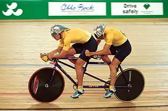 Action shot of Australian track cyclists Eddie Hollands and Paul Clohessy during the 2000 Sydney Paralympic Games.