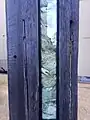 Close up of organic materials such as hair, shell, bone, and feathers embedded in windows of timber pillar