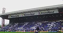 It currently holds 2,411 and is occasionally given to larger away supporters, if seats are not required by home supporters. There are toilets and refreshment facilities on a small outdoor concourse behind the stand, which backs onto a small reservoir. As with the Main Stand opposite, the roof is supported towards the front by several steel columns; their thickness and location are partly explained by the fact that when the current roof was built, in 1956, it had to be erected in front of an existing roof, which covered only the rear part of the then much deeper and higher terrace.