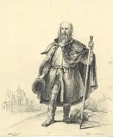 Jonathan Oldbuck, the antiquary of the novel's title, says that Ochiltree "has been soldier, ballad-singer, travelling tinker, and is now a beggar…a sort of privileged nuisance – one of the last specimens of the old-fashioned Scottish mendicant, who kept his rounds within a particular space, and was the news-carrier, the minstrel, and sometimes the historian of the district".[2] Ochiltree's great love and knowledge of the old ballads and traditions echoes Oldbuck's more scholarly antiquarian lore. They have a mutual respect and liking for each other, and between them they solve the other characters' problems and bring the novel to a happy resolution, but on the way they sometimes clash comically, Oldbuck's antiquarian fantasy and self-delusion being punctured by Ochiltree's realism and good sense.[3][4][5] Both characters are presented as being sticklers for exactness, Ochiltree being remarkable for the accuracy of the local news he brings and for his insistence on old traditions being remembered correctly. In the first half of the novel the two are differentiated by Ochiltree's greater practical effectiveness in the help he brings to others.[6] He could be described as a Cynic in the tradition of Diogenes,[7] and he is at odds with modern commercial society in his traditional reliance on the support of the community at large rather than on any single patron.[8] His overall function in the Fairport community is to bind it together.[9]