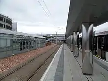 The airport has no dedicated railway station. However, it is served by the nearby Edinburgh Gateway station, which serves as an interchange with Edinburgh Trams services to the airport.[48] The tram line also connects the airport to the nearby Edinburgh Park railway station.[49]
