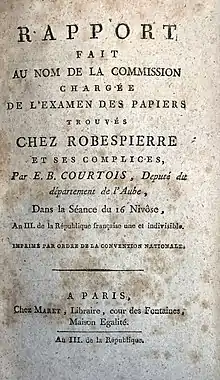 He published the famous report «Papiers inédits trouvés chez Robespierre, Saint-Just etc.» in February 1795.[7] It is possible he added, and left papers out.[8][9][10]
