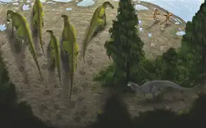 As many as three quarters of the dinosaur specimens from the badlands near Drumheller may pertain to Edmontosaurus regalis.[40] The Horseshoe Canyon Formation is interpreted as having a significant marine influence, due to the encroaching Western Interior Seaway. This shallow sea stretched from the Gulf of Mexico to the Arctic Ocean, covering the midsection of North America through much of the Cretaceous.[41] E. regalis shared this setting with fellow hadrosaurids Hypacrosaurus and Saurolophus, the parksosaurid Parksosaurus, the ceratopsids Montanoceratops, Anchiceratops, Arrhinoceratops, and Pachyrhinosaurus, the pachycephalosaurid Stegoceras, the ankylosaurid Euoplocephalus, the nodosaurid Edmontonia, the ornithomimids Ornithomimus and Struthiomimus, a variety of poorly known small theropods that included troodontids and dromaeosaurids, and the tyrannosaurids Albertosaurus and Daspletosaurus.[34]