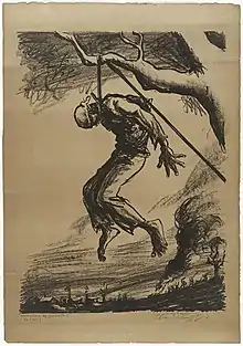 This cartoon is one of Duffy's many anti-lynching pieces. This one, however, deals with white on white lynching. In California, people took two kidnappers from prison and lynched them in a park, but the Governor praised the people that did the lynching. Duffy condemned the Governor in this cartoon.[4]