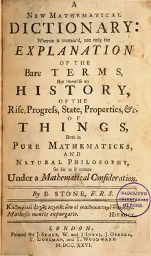 With the Duke's support, Stone moved to London c. 1720,[6] where he likely worked as a mathematics tutor.[7] He published translations of the Marquis de l'Hospital's posthumous book about conic sections in 1720 and Christopher Clavius's translation of Theodosius's Spherics in 1721. In 1723 he published a translation of Nicholas Bion's Construction and Principal Uses of Mathematical Instruments, to which he added descriptions of the English variants of the French instruments described by Bion; this book became the standard reference about the subject in English throughout the 18th century.[8] In 1725 he was elected a Fellow of the Royal Society,[9] and from 1725 until at least 1736 he was a member of the Board of Green Cloth.[10] His New Mathematical Dictionary appeared in 1726, a cheaper alternative to John Harris's Lexicon Technicum.[11] He also translated Euclid's Elements (1728); l'Hospital's differential calculus book Analyse des Infiniment Petits, to which he adjoined a second part about integral calculus, as The Method of Fluxions (1730);[12] and Isaac Barrow's Geometrical Lectures (1735).