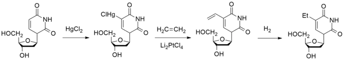 - ↑ Bergstrom DE, Ogawa MK (1978). "C-5 substituted pyrimidine nucleosides. 2. Synthesis via olefin coupling to organopalladium intermediates derived from uridine and 2'-deoxyuridine". Journal of the American Chemical Society. 100 (26): 8106–8112. doi:10.1021/ja00494a014.