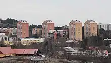 Edsberg (ⓘ) is an urban district in Sollentuna Municipality, Stockholm County, Sweden. It is located at the bottom of the Edsviken Bay, which forms a long inlet all the way from the Baltic Sea. It forms part of Stockholm. In daily use Edsberg means the area with multifamily houses spread around Edsbergs centrum and Edsbergskyrkan north of Danderydsvägen. The municipality part called Edsberg also contains Landsnora, an area of villas to the south of Danderydsvägen and the east of Edsbergsparken. A bit further on to the south of Danderydsvägen is the new area called Kvarnskogen with a mixed set of house types. Also contained in Edsberg is Edsängen between Edsberg and Frestavägen, and the summer house areas a bit further north called Södersättra and Norrsättra. Plans to develop the area to the east of Frestavägen are in the making.