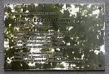 After the assassination attempt on Hitler in 1944, Hamm was arrested on 2 September as part of the "Operation Grid" by the Gestapo and taken to the Lehrter Straße prison in Berlin, where he died under circumstances that have still not been clarified. According to a Gestapo officer's testimony, he had jumped out of a window during an interrogation and died as a result of the fall. The suicide theory was later repeated in literature and interpreted to mean that Eduard Hamm wanted to avoid revealing the names of accomplices.[1]