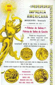 It was in the headquarters of Imprenta Americana in Maracaibo where, for the first time in Venezuela, photographs and illustrations were printed in a periodical publication.[7] It was also the first workshop in Venezuela to print illustrations mixing three different colors.[3] This publishing house won several prizes in national and international fairs.[8]