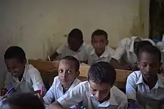 Following the outbreak of the Somali Civil War in 1991, the task of running schools in Somalia was initially taken up by community education committees established in 94% of the local schools.[6] Numerous problems had arisen with regard to access to education in rural areas and along gender lines, quality of educational provisions, responsiveness of school curricula, educational standards and controls, management and planning capacity, and financing. To address these concerns, the Puntland government is in the process of developing an educational policy to guide the region's scholastic process as it embarks on the path of reconstruction and economic development. The latter includes a gender sensitive national education policy compliant with world standards, such as those outlined in the Convention on the Rights of the Child (CRC) and the Convention on the Elimination of All Forms of Discrimination against Women (CEDAW).[7] Examples of this and other educational measures at work are the government's enactment of legislation aimed at securing the educational interests of girls,[8] promoting the growth of an Early Childhood Development (ECD) program designed to reach parents and care-givers in their homes as well as in the ECD centers for 0-5-year-old children,[9] and introducing incentive packages to encourage teachers to work in remote rural areas.[10]