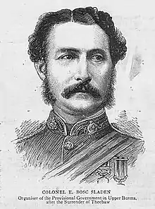Sir Edward Bosc Sladen (20 November 1831 – 4 January 1890) was an Indian Army officer who served in India and Burma. He organised a provisional government in Upper Burma and oversaw the surrender of King Thibaw.