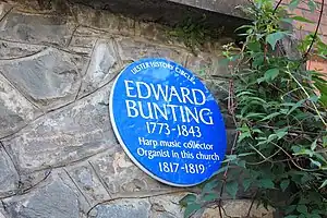 Bunting went on a number of collecting tours between 1792 and 1807, and was the first to transcribe music 'in the field' as played by the musicians. He realised the importance of the Irish words to the songs and Patrick Lynch was employed to collect these. Bunting, who lived in Belfast with the McCrackens until his marriage in 1819, moved to Dublin where he held the post of organist at St. George's Church. He died in Dublin on 21 December 1843 and is buried at the Cemetery of Mount Jerome, Dublin.[1]