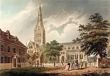 Dayes drew from nature in various parts of England, including the Lake District and Wales.[1] Much of his topographical work depicted ruins, painted in a palette dominated by blues and greens, which had an influence on the early work of J. M. W. Turner.[3] He laid out detailed rules for the correct method of laying down the colours in landscape in his Instructions for Drawing and Colouring Landscapes, published posthumously.[4] The art historian Graham Reynolds sees Dayes' work as "mark[ing] the transition from the eighteenth to the nineteenth century".[3]