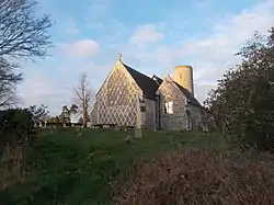Barsham church (its east front flushwork and tracery showing the Echyngham fretty heraldry) and its rectory stand on rising land overlooking the Waveney valley from the south.[15] The Hall was on the low ground some 600 metres to the north, at the edge of the river plain opposite Geldeston,[16] and held fishery and swannery rights downstream towards Roos Hall fleet,[17] rights which were defended at the common pleas.[18] The manor lay near the Garneys residences at Roos Hall and Redisham Hall, and the manor of Shipmeadow, an endowment of Mettingham College.[19]