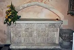 A table tomb set against, and partly into, the north wall of the chancel of Barsham church is evidently that of Sir Edward Echyngham. When it was dismantled and reconstructed in 1869, a fragment of an inscription "hic jacet d'n's Ed..." (Here lies lord Edward...) was found inside. What remains is only a fragment of a larger monument, which would have included the four-foot-high figures of his advowrer saints.