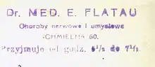 Dr. med. E. Flatau. Nervous and mental diseases. Chmielna 60 Street [Warsaw]. Hours 5 pm and 1/2 till 7 pm and 1/2. This is medical doctor seal from a medical prescription issued on 27 August 1920.