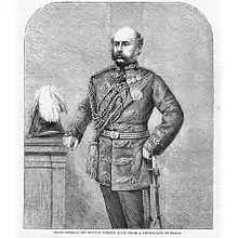 Commissioned as an Ensign in the 31st Regiment of Foot in August 1828,[4] Lugard fought in the Battle of Kabul in 1842 during the First Anglo-Afghan War. He then served in the First Sikh War (1845–46), taking part in the battles of Moodkee, Aliwal and Sobraon, later also serving in the Second Sikh War (1848–49).[5] He became Adjutant General for the Punjab District in 1848, then Deputy Adjutant General in Bombay in 1854, before acting as Chief of Staff during the Persian campaign (1856–57),[5] and Adjutant-General in India from July 1857.[6] He commanded the 2nd Division at the Capture of Lucknow in 1858 during the Indian Rebellion,[5] and became a Knight Commander of the Order of the Bath in January 1858.[7]
