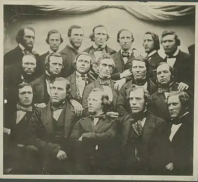 Edward Martin and 17 other missionaries in Liverpool. Edward is on the far right of the middle row.