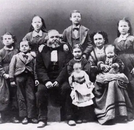 Photo taken by Edward's competitor, Charles W Carter. Contains Edward Martin, his wife Eliza Salmon, and their seven children: Charlotte, Edward Thomas, Emma, Brigham, Eliza, Napoleon, and Martha. Taken around 1870.