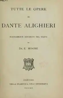Edward Moore, FBA (1835–1916) was an English scholar who specialized in Dante Alighieri. He was Principal of St Edmund Hall, Oxford from 1864 to 1903.