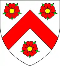 Arms of Phelips: Argent, a chevron gules between three roses of the second seeded or barbed vert
