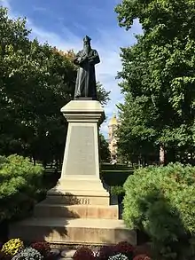Several memorials have been dedicated to Sorin on the campus of the University of Notre Dame. A staue of Edward F. Sorin, on the intersection of the main and south quads, is one of the main landmarks on the Notre Dame Campus.[32][33] Sorin Hall was dedicated to Sorin in 1888, with Sorin himself present.[34][35] Sorin Court, a street behind Main Building, and Sorin's, the restaurant inside the Morris Inn, are also named after him.[36] Several other programs on campus, such as the Sorin Fellows and the Sorin Scholars, are named in his honor.[37][38] The city of South Bend has dedicated Sorin Street and Sorin Park in his honor, and Sorin Street in Austin is also named after him.[36][39] Sorinsville was an Irish immigrant neighborhood in South Bend that developed in the 19th and 20th centuries.[40] On the campus of St. Edward's University, Sorin Hall and the Sorin Oak, the largest oak tree in Austin, are named after him.[25]