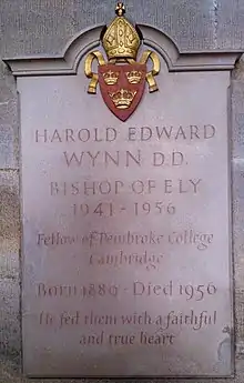 He died suddenly on 12 August 1956, having proved very popular and acquiring a reputation as "... one of the gentlest and most compassionate of men ... Everybody who knew him well will know how consistently benevolent he always was".[10] Wynn was the first alumnus of Ely Theological College to become a diocesan bishop.[11] There is a commemorative plaque in Ely Cathedral.