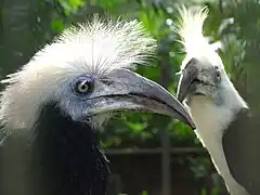 Some of the characteristic birds cannot be housed in the main aviary. Large hornbills predate smaller birds, they can only be seen in the three smaller display cages. Three displays let visitors view at a close range. Two cages house the white-crested hornbill and the great pied hornbill, while the other holds various species of birds of the Malesian region.