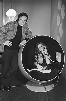 Aarnio studied at the Institute of Industrial Arts in Helsinki and started his own office in 1962. The following year, he introduced his Ball Chair, a hollow sphere on a stand, open on one side to allow a person to sit within.[2] The Ball Chair was introduced to the international public at the Asko stand at the Cologne furniture fair in 1966.[3] The similar Bubble Chair was clear and suspended from above. Other innovative designs included his Pastil Chair (a beanbag-like molded armchair),[4] and Tomato Chair (a seat molded between three supporting spheres). His Screw Table, as the name suggests, had the appearance of a flat head screw driven into the ground. He was awarded the American Industrial Design award in 1968.