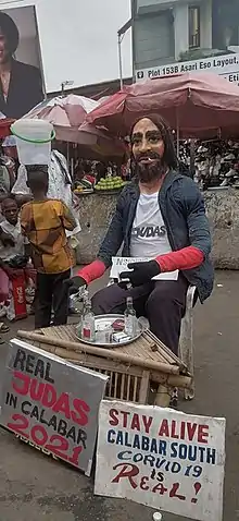 The evil spirits are expected to inhabit the Nabikim prior to the festival.[19] On the Night of the festival, a lot of Noise is made.[19] Cannons are fired, drums are beaten, bells are rung.[19] The noise was expected to frighten the devil and evil spirits with the intention of chasing them out of town.[20] By morning, the Nabikim were thrown away into the river.[20][21] According to Hope Waddell, "There were sometimes real outbursts of grief on these occasions; on the remembrance of departed relatives, thus finally expelled heart-breaking passionate bewailings."[22] The Ndọk festival later metamorphosed into a celebration of the New Year's eve Ubin Usua but the Nabikim is not made for this celebration.[23][21] Nabikim effigies are made for mbre judas (Judas play) which holds on Good Friday.[23] On Good Friday, young people put these Nabikim effigies on the streets and at noon, they begin to beat the effigies with sticks, shouting "Judas killed Christ".[23][21]