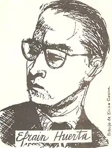 Efraín Huerta (June 18, 1914 – February 3, 1982)[1][2] was a Mexican poet and journalist. Born and raised in the state of Guanajuato, he moved to Mexico City initially to start a career in art. Unable to enter the Academy of San Carlos, he attended the Escuela Preparatoria Nacional, where he met writers such as Rafael Solana, Carmen Toscano and Octavio Paz. He had been writing poetry since he was young, but initially opted to attend law school; however, when he published his first book of poems, he left it to pursue writing full-time. As a poet, he published regularly from the 1930s to the 1980s, and as a journalist collaborated with over twenty newspapers and journals, under his own name and using pseudonyms. He was also active politically, a communist and Stalin supporter through his life with his social and political ideas finding their way into his writing. Poetically, he is part of the Taller generation of Mexican poets, although his development was a bit different from others in this group. Near the end of his career, his work had developed a colloquial style, including work focusing on Mexico City and creating a new form called a “poemínimo.”