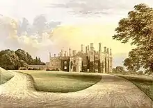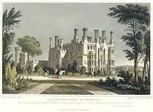William Fellowes had alleged that his sister Mary had influenced both his father and his brother to make wills which were not in his favour. The will was deemed valid, and the unfortunate Mrs Brown was imprisoned in the Fleet, from where she made a plea for financial assistance to fight the case and secure her legacy and annuity.[25] Affidavits had been lodged in court testifying that she was already married, presumably to Mr Brown, and also to her bad character and the fact that she had not been pregnant over the past 12 or so years.[26] Newton Wallop was deemed the legal heir under the will and thus inherited Eggesford and by royal licence in 1794 duly adopted for himself and his issue the name and arms of Fellowes.[27] Fellowes' second wife Lady Catharine Fortescue, a daughter of Hugh Fortescue, 1st Earl Fortescue (1753–1841) of Castle Hill, Filleigh appears to have been the driving force behind the demolition of the old Eggesford House located immediately to the west of the parish church, and the building of the new Eggesford House, about a mile further east on the brow of a hill, the site of Heywood House in the parish of Wembworthy, ancient seat of the Speke family,[28] which was demolished as part of the scheme. Catharine had at first planned merely to enlarge and remodel the old house, and had drawings prepared by her father's architect Thomas Lee (died 1834) of Barnstaple.