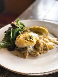 Cooked fresh spinach is creamed with a bechamel sauce, a drop or two of Tabasco sauce is added, and pre-cut artichoke bottoms are warmed in a 175°F oven for five to ten minutes. The eggs Sardou are assembled by placing spoonfuls of the warm creamed spinach on a warmed plate. The artichoke bottoms are placed on top of the creamed spinach and the poached eggs are set inside the artichoke bottoms. The assembly is then covered in the Hollandaise sauce.[1] Some cooks omit nutmeg and cloves from the bechamel sauce when using it to cream spinach for eggs Sardou. Eggs Sardou can also be served with truffles, ham and anchovies.