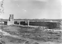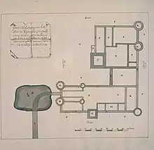There is a single source that claims that Egmond Castle was destroyed in 1315. If such were true, the circular castle would have been destroyed that year.[8] Renaud thought it more likely that this happened during the rebellions after the death of Count Floris V.[9] In both cases a wall fragment retrieved in the northwest moat could be a leftover of the destruction.[8] The distance between the round castle, and the new (third) castle makes it likely that the round castle lost its use in about 1300.[9] The existence of the circular water castle was then forgotten till it was rediscovered in the 1930s.[10] See: 18th century floor plan.
