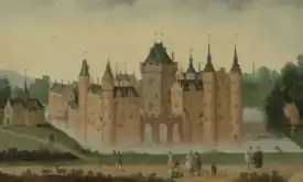 Little is known about the first castle of the Lords of Egmond. In the 1930s Wouter Braat discovered that under the later main castle, there were signs of previous habitation.[2] He found remains of an old palisade, and also some very heavy oak piles, with burned heads. Jaap Renaud thought it possible and tempting to consider these to be remains of the first castle.[3] It is not known when the first castle was built. Some say this was in about 1050. Others say it was in 1150.[2]