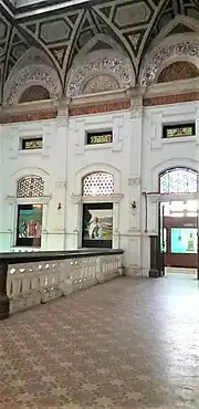 Many additions to the original building were constructed between 1864 and 1890. The core of the old museum building includes the only surviving remnants of the Pantheon, identified from the broad steps leading into it when viewed from the north. Amongst the additions is the Connemara Public Library, built with stained glass windows, ornate woodwork and elaborate stucco decorations, formally opened in 1896 and named after its progenitor. The building was built by Namberumal Chetty and was designed by Henry Irwin, with the interiors resembling those of Bank of Madras (SBI). The design included a huge reading room with a wooden ceiling between two curved rows of stained glass, supported by ornate pillars and arches embellished with sculpted acanthus leaves. It was supplemented with teakwood furniture, marbled floor, and decorative windows. All of these were restored in 2004–2007. The building now houses the Old Collection (pre-1930), which is used for reference purpose only.[5]
